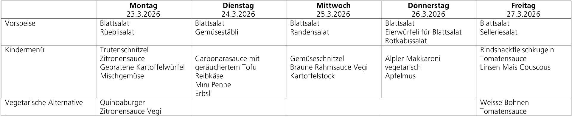 Menüplan Tagesschule vom 23.03. bis 27.03.2026